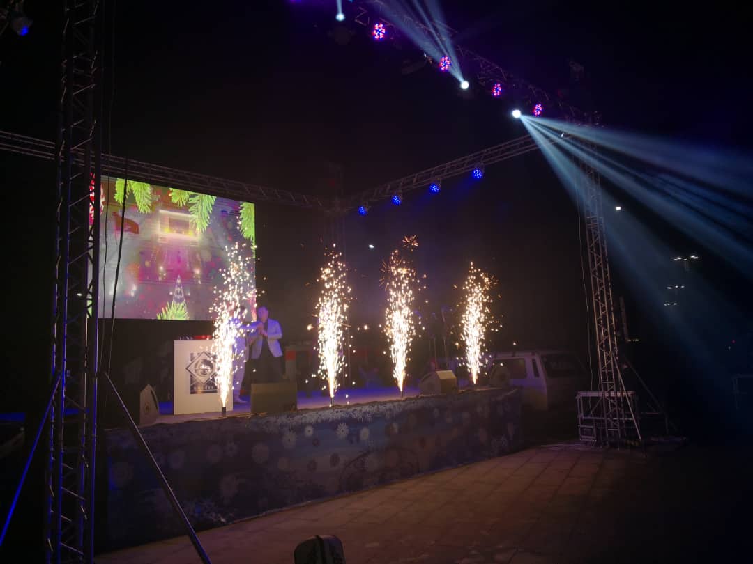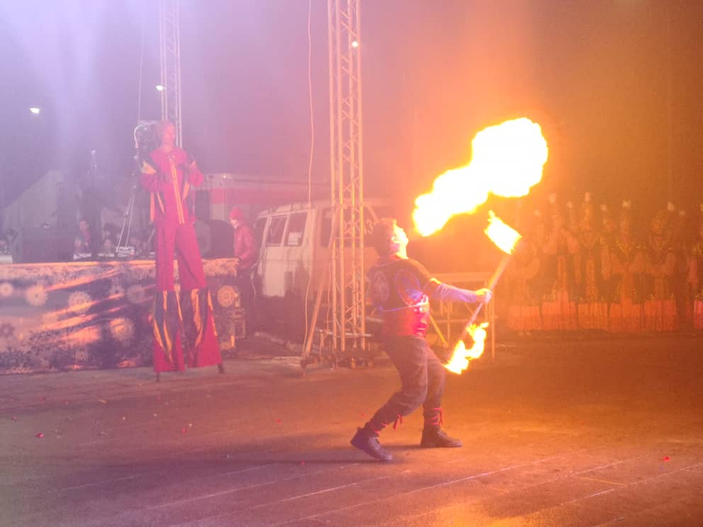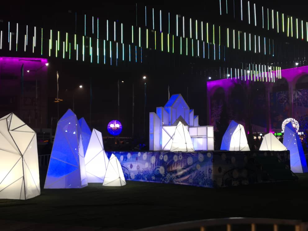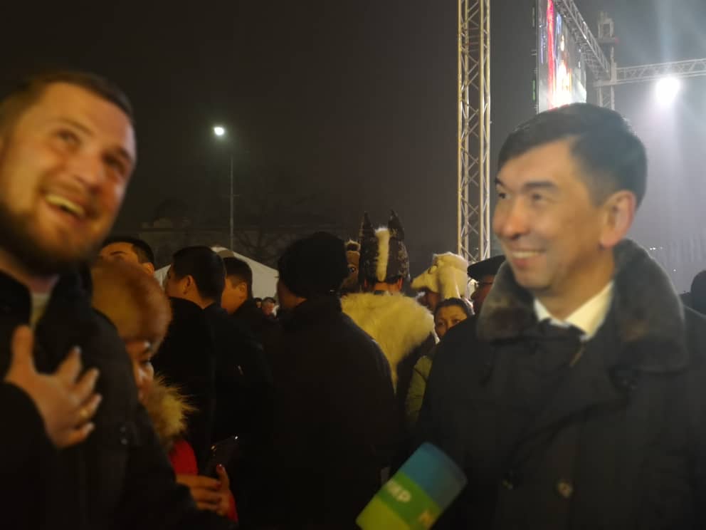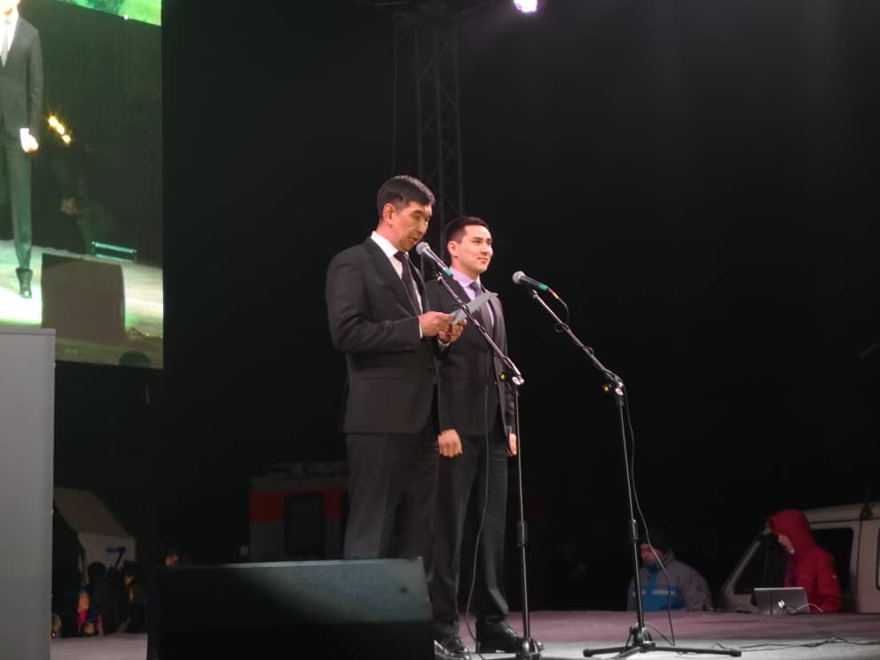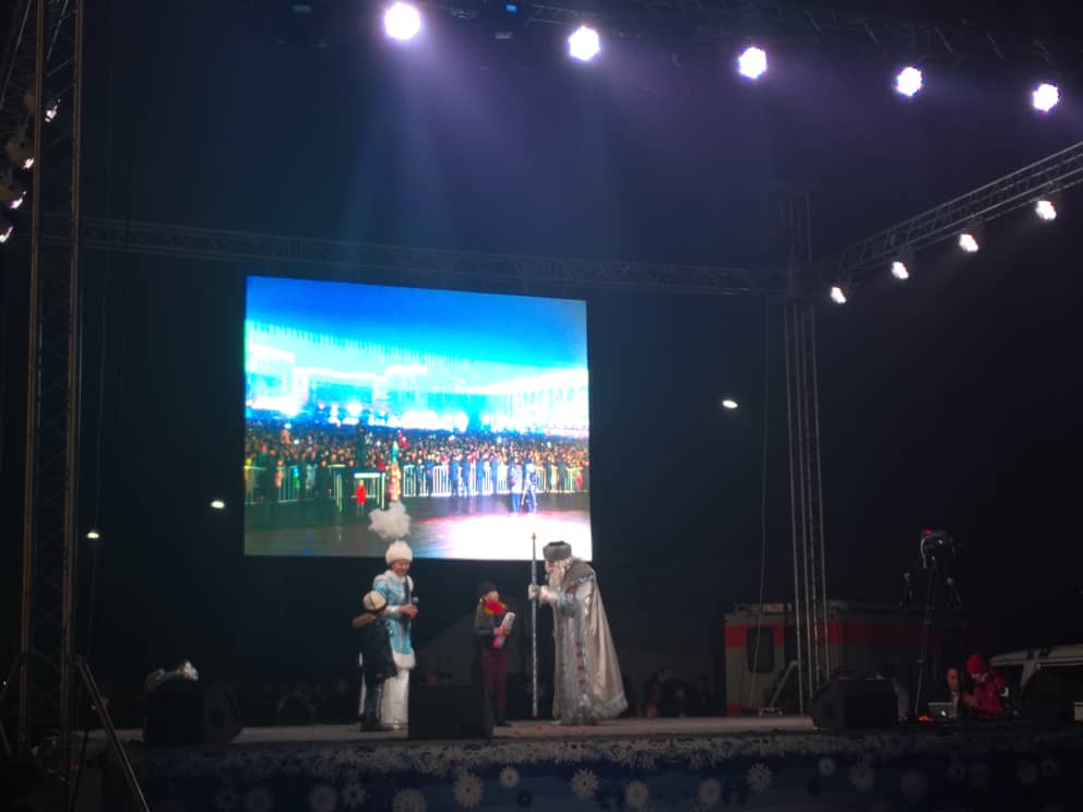 «Елка — это главный атрибут Нового года, и прямо сейчас мы должны ее зажечь», — сказали ведущие и пригласили на сцену мэра города Азиза Суракматова и главу Бишкекского городского кенеша Жаныбека Абирова.