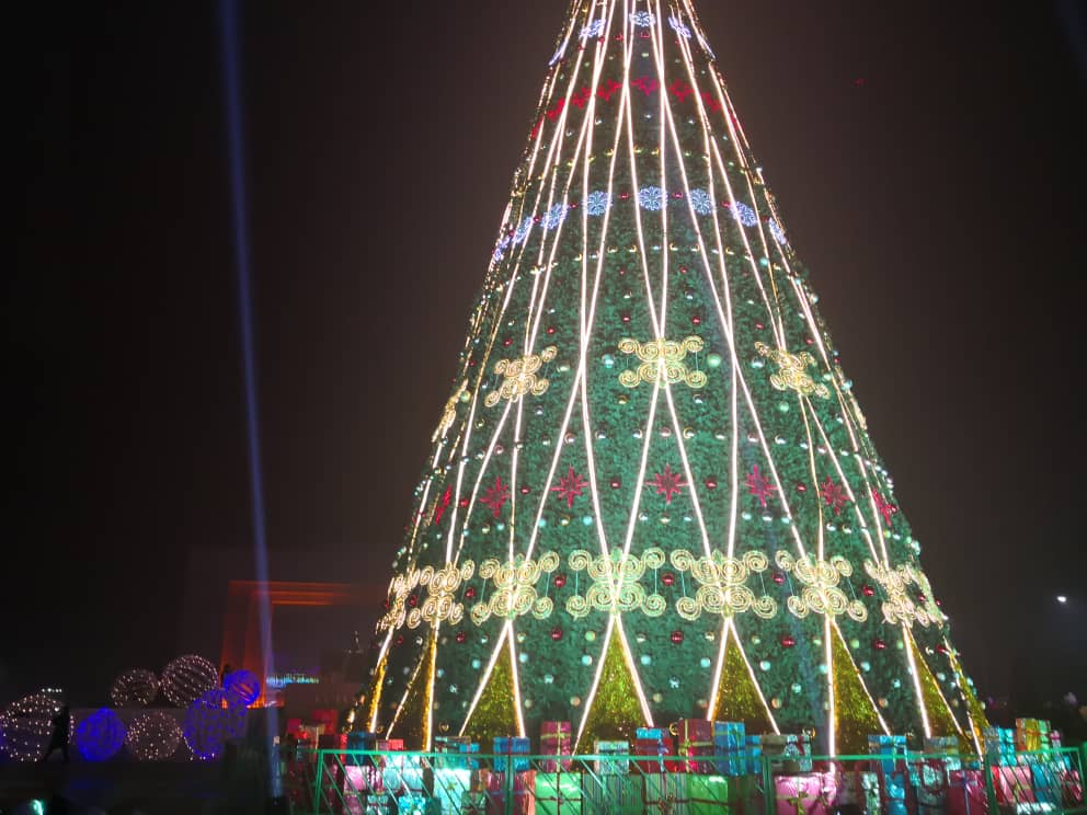 Высота главного новогоднего дерева 25 метров. Ель украшают около тысячи игрушек, новогодний узор из дюралайта, светодиодная гирлянда, 440 метров мишуры и около 40 тысяч светодиодных светильников.