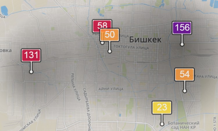 Общественное объединение MoveGreen и активист из Алматы Павел Александров собрали для Бишкека датчики и привязали их к карте.Для подсчета уровня загрязнения берут среднесуточные показатели. На карте также отмечен уровень загрязнения в режиме онлайн.