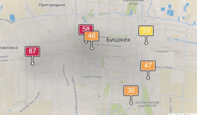 Общественное объединение MoveGreen и активист из Алматы Павел Александров собрали для Бишкека датчики и привязали их к карте.Для подсчета уровня загрязнения берут среднесуточные показатели. На карте также отмечен уровень загрязнения в режиме онлайн.
