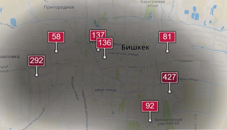 3. В районе улиц Бейшеналиевой/Токтогула. Уровень загрязнения превышен в 2,3 раза: PM2.5 среднесуточный — 81 мкг/м³, на момент измерения — 137 мкг/м³.