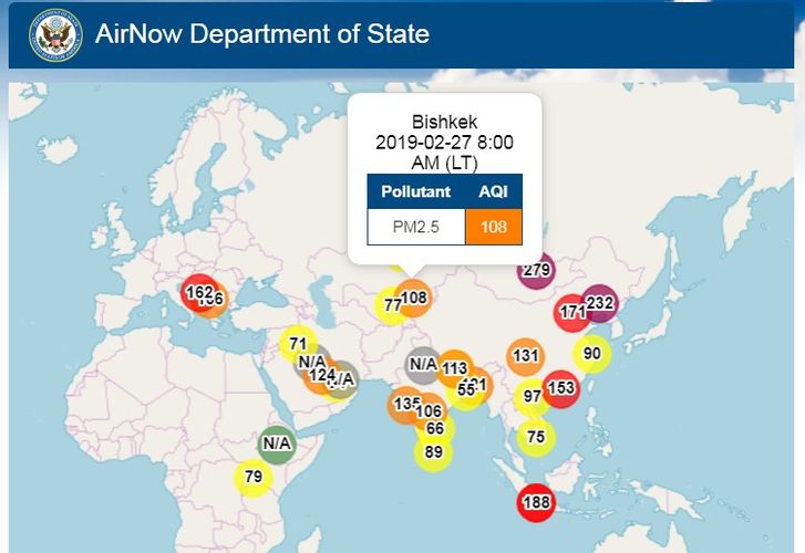 Посольство США в Кыргызстане также установило датчик, измеряющий уровень загрязнения воздуха. Информация обновляется ежечасно.