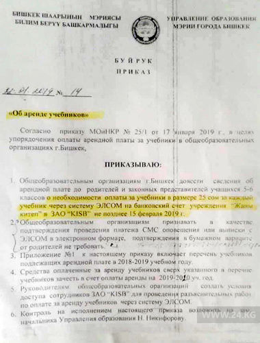 17 января 2019 года Министерство образования выпустило приказ об упорядочении системы оплаты за аренду учебников. Во исполнение этого документа управление образования мэрии Бишкека выпустило свой приказ. В нем четко и ясно указано, что оплату за учебники нужно проводить исключительно через кошелек «Элсом».