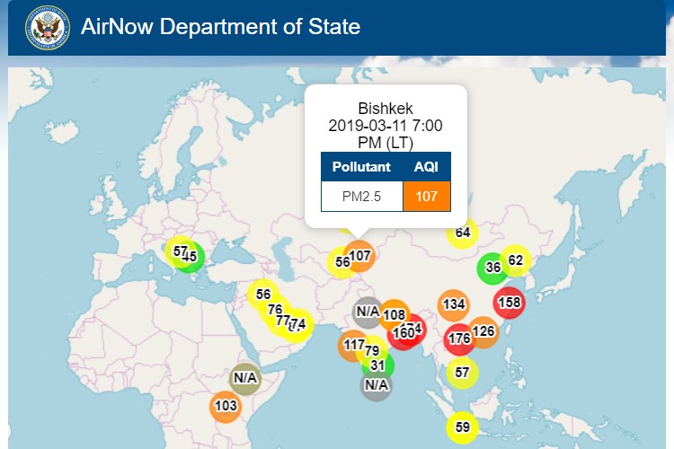 Посольство США в Кыргызстане также установило датчик, измеряющий уровень загрязнения воздуха. Информация обновляется ежечасно.