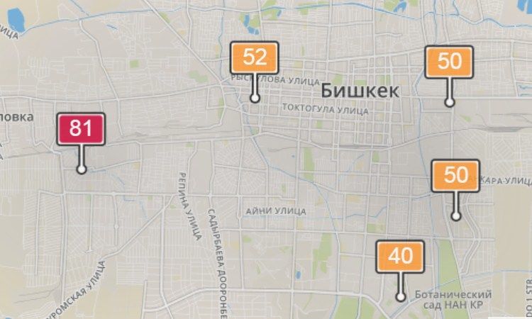 1. Жилмассив «Ак-Орго». Уровень загрязнения превышен в 2,65 раза: PM2.5 среднесуточный — 93 мкг/м³, на момент измерения — 81 мкг/м³.