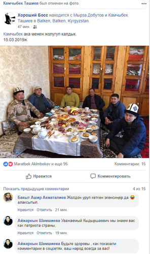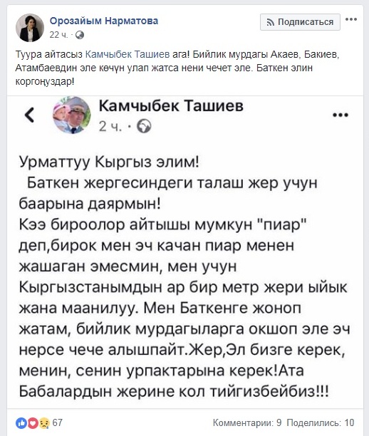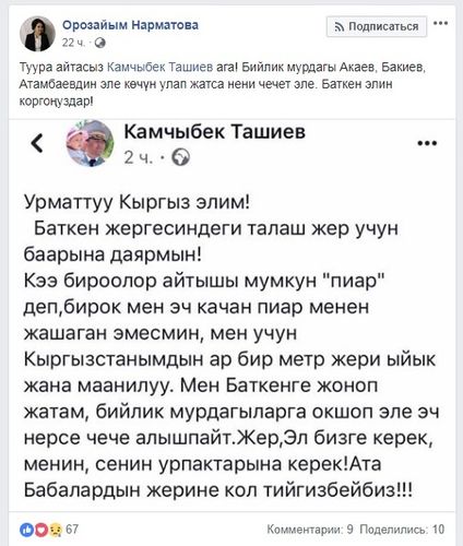 «Некоторые могут сказать, что я, пользуясь случаем, провожу свой пиар. Но это не так. Для меня каждый метр кыргызской земли драгоценен. Я еду в Баткен. Власть, как и прежняя, ничего не делает и не решит. Земля и народ наш — все это нужно будущему поколению», — написал в социальной сети Facebook Камчыбек Ташиев.