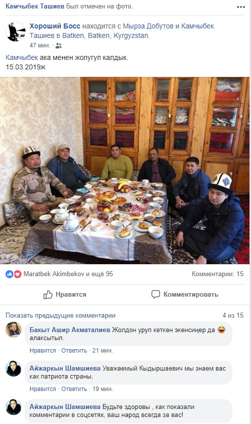 Спустя сутки он нашелся. Его товарищи разместили фото, где он в гостях в доме одного из жителей Баткенского района, за накрытым столом. Сам Камчыбек Ташиев не прокомментировал ни словом тревожную обстановку в зоне конфликта.