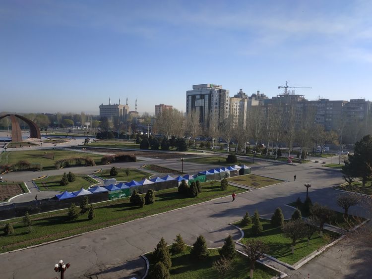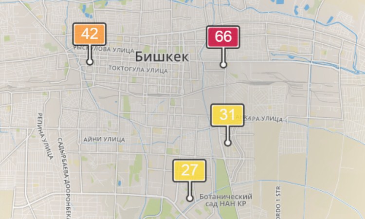 1. В районе улиц Бейшеналиевой/Токтогула. Уровень загрязнения не превышен: PM2.5 среднесуточный — 30 мкг/м³, на момент измерения — 42 мкг/м³.