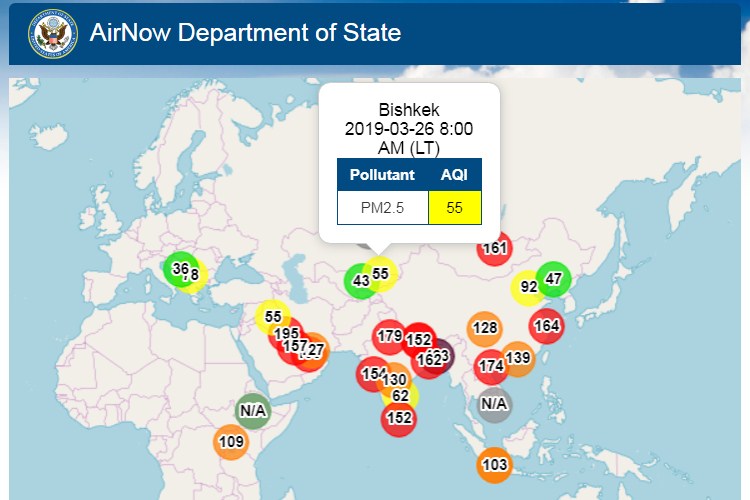 Посольство США в Кыргызстане также установило датчик, измеряющий уровень загрязнения воздуха. Информация обновляется ежечасно.