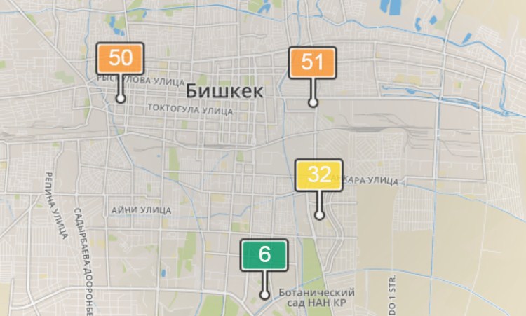 1. В районе улиц Бейшеналиевой/Токтогула. Уровень загрязнения не превышен: PM2.5 среднесуточный — 34 мкг/м³, на момент измерения — 50 мкг/м³.