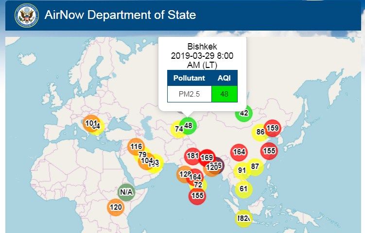 Посольство США в Кыргызстане также установило датчик, измеряющий уровень загрязнения воздуха. Информация обновляется ежечасно.