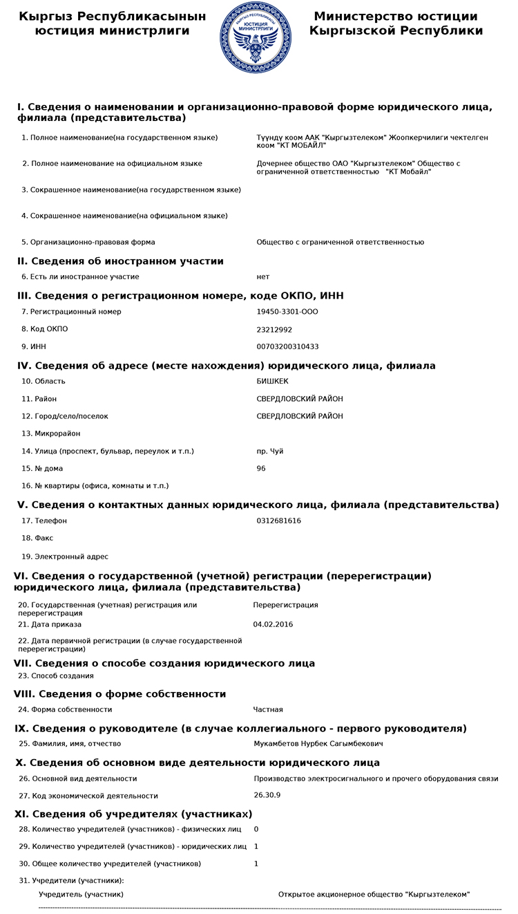 В ноябре 2018-го ОсОО «КТ Мобайл» объявило аукцион на право заключения договора о совместной деятельности. Торги выиграла компания MegaCom, заплатившая за право работы 345 миллионов сомов.