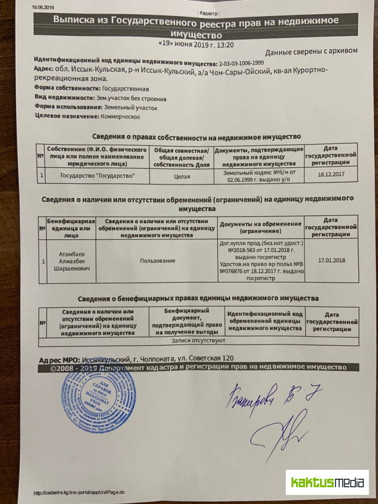 Редакция обратилась с запросом в ГРС, решив выяснить, действительно ли участок, расположенный по адресу: Иссык-Кульская область, село Чон-Сары-Ой, курортно-рекреационная зона, зарегистрирован на имя экс-президента Кыргызстана.