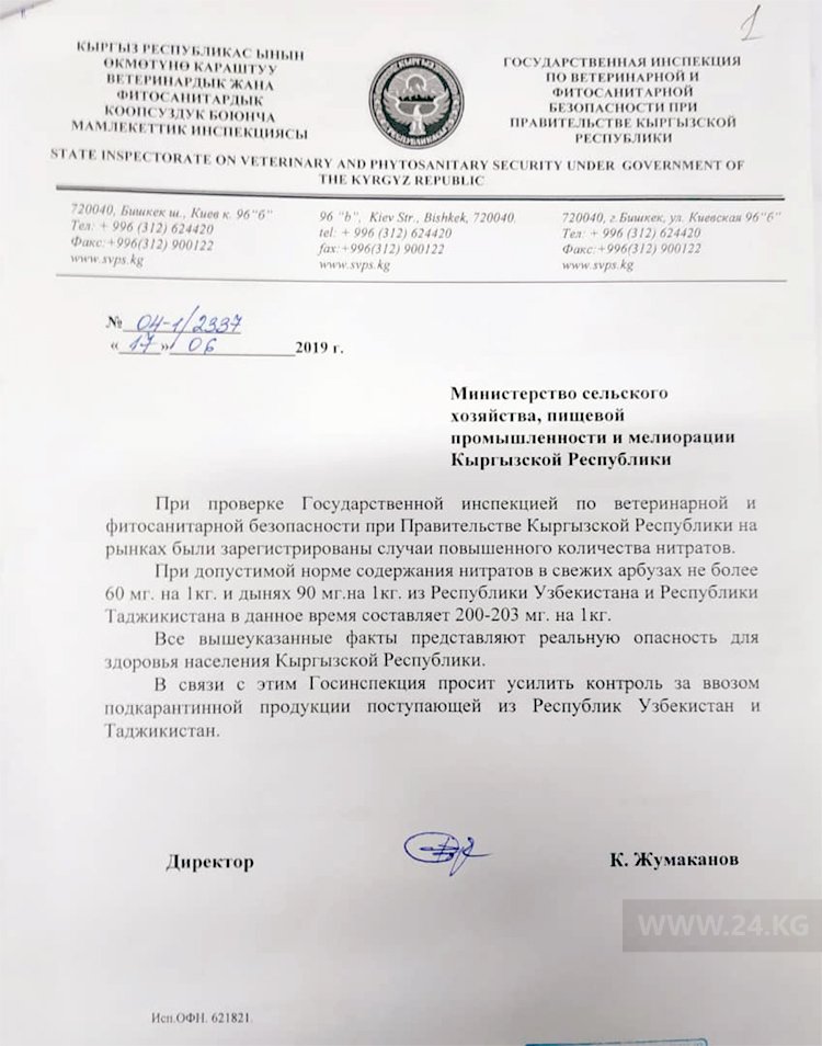 Госинспекция по ветеринарной и фитосанитарной безопасности просит усилить контроль за ввозом арбузов и дынь из Узбекистана и Таджикистана. Об этом говорится в официальном письме главы инспекции Калыса Жумаканова в Минсельхоз.