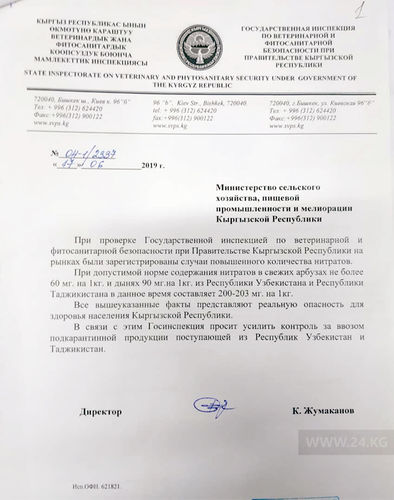 Ранее сообщалось, что на рынках Ошской области продают арбузы и дыни, привезенные из соседних стран. Норма нитратов в арбузах и дынях превышена в 15 раз. Стоимость дынь составляет от 30 до 100 сомов, а арбузов — от 100 до 140 сомов.