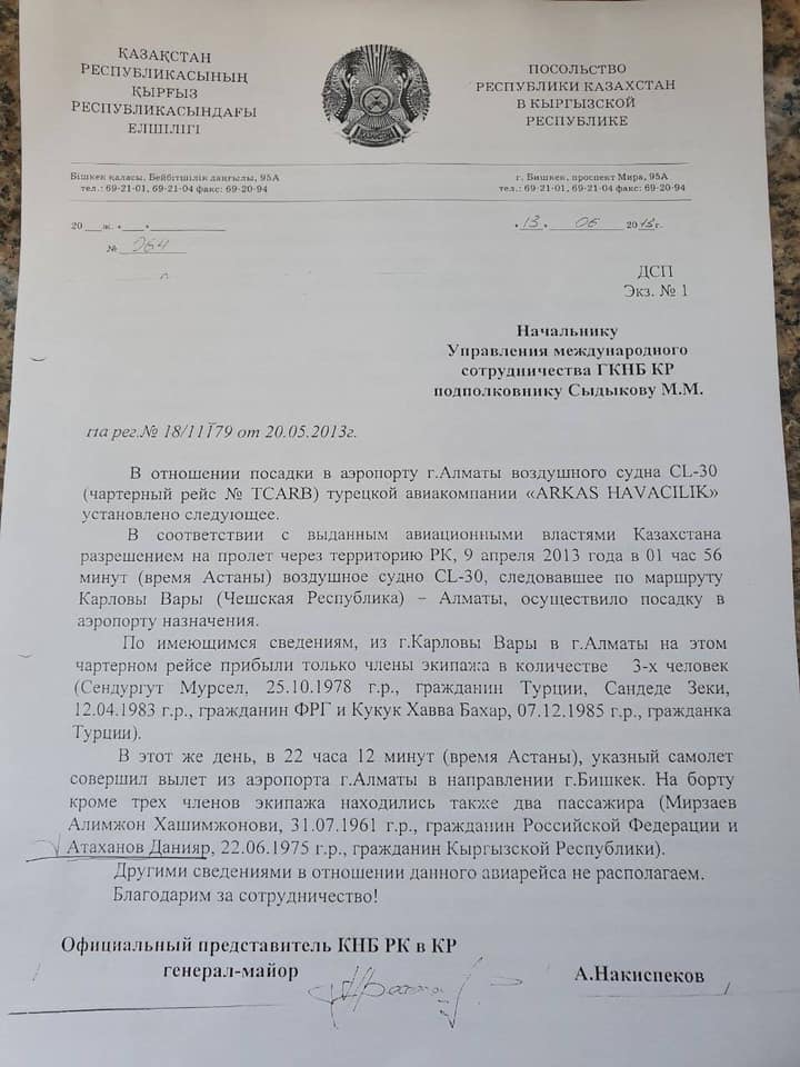 В частности, среди опубликованных бумаг есть ответ из посольства Казахстана в Кыргызстане. В нем говорится, что 9 апреля 2013 года из города Карловы Вары (Чехия) в Алматы прилетел самолет CL-30 (чартерный рейс № TCARB) турецкой авиакомпании ARKAS HAVACILIK.