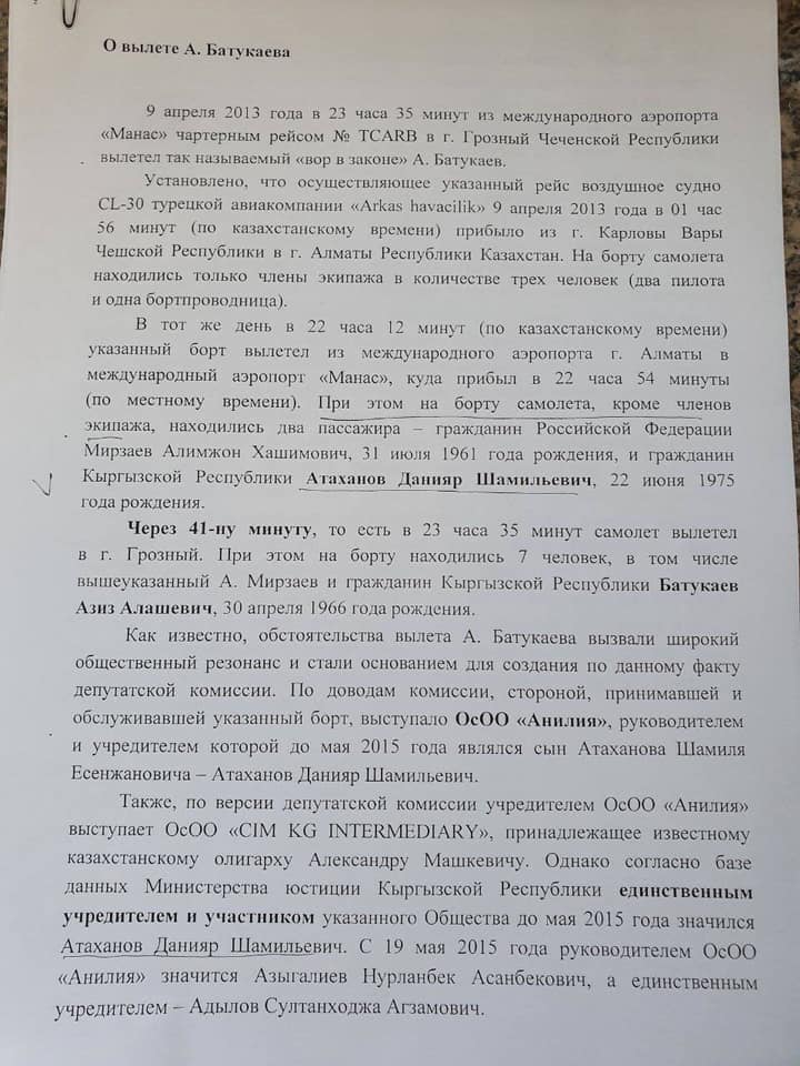 Кроме того, в соцсетях опубликовали справку, вероятно, подготовленную по итогам расследования депутатской комиссии. В ней также говорится о рейсе № TCARB. В документе указано, что самолет CL-30 турецкой авиакомпании ARKAS HAVACILIK приземлился 9 апреля 2013 года в аэропорту «Манас» в 22.54. В тот же день, через 41 минуту, вылетел в город Грозный (Чечня). Но на борту находились уже семь человек, в том числе Азиз Батукаев и Алимжон Мирзаев.