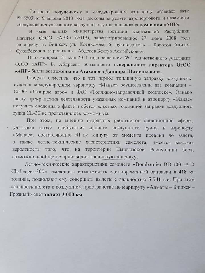 Отмечается, что расходы за услуги аэропортового и наземного обслуживания воздушного судна оплачивала компания «АПР», зарегистрированная в 2008 году. Ее учредитель Абдраев Бектур Асымбекович, а руководителем был Болотов Адилет Суюнбекович. С мая 2011-го обязанности гендиректора возложены на Данияра Атаханова.