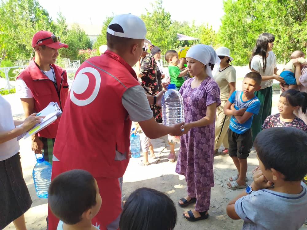 Сегодня Красный Полумесяц Кыргызстана раздает бутилированную воду и оказывает психосоциальную поддержку семьям в пяти приютах для эвакуированных.