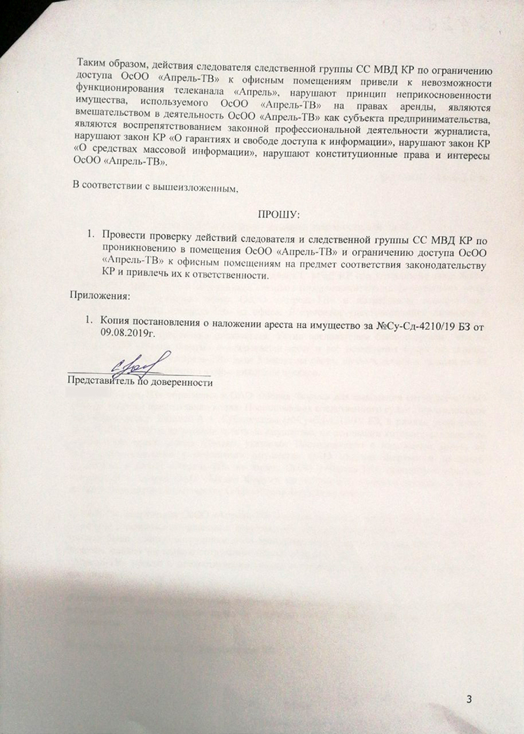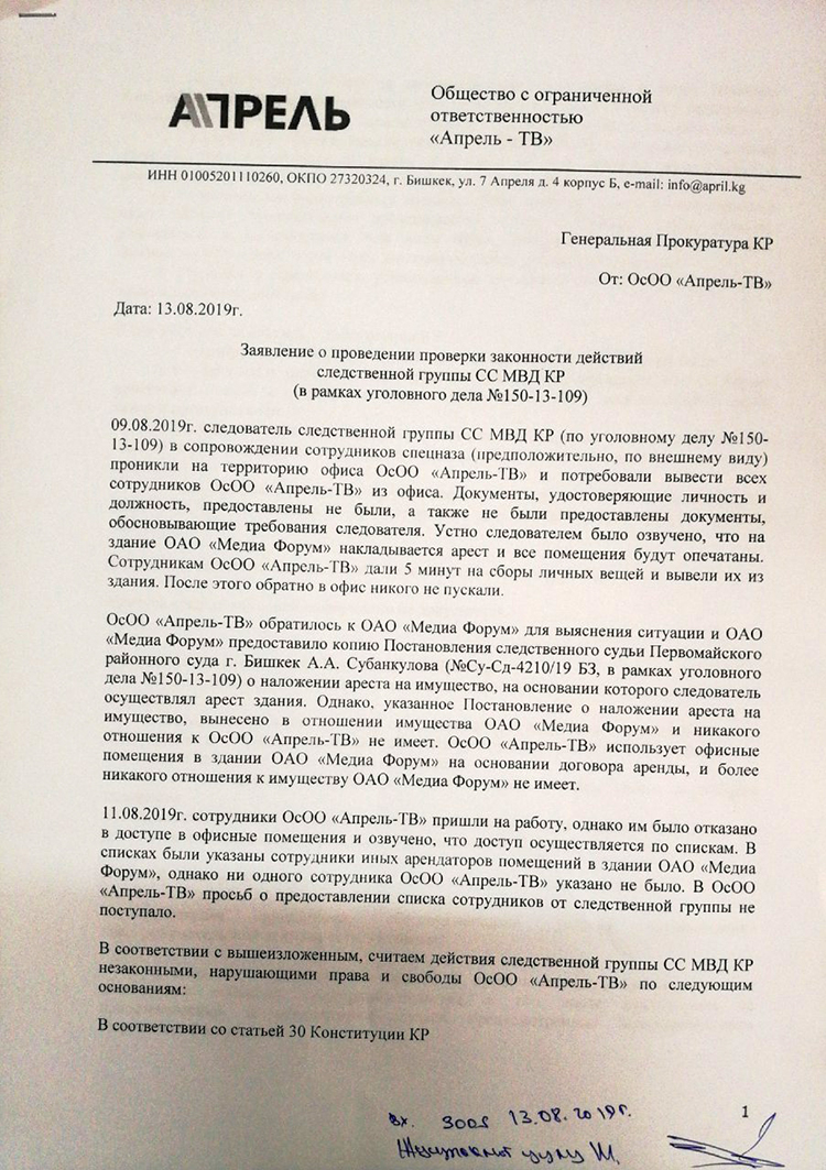 Отмечается, что они обжалуют действия группы следственной службы МВД КР. В обращении юристов сказано, что 9 августа 2019 года следователь в сопровождении сотрудников спецназа проник на территорию ОсОО «Апрель-ТВ» и потребовал вывести всех работников телеканала из офиса. На сбор дали пять минут. При этом документов, удостоверяющих личности и должности, силовики не предъявили, как и актов, обосновывающих требования следователя.