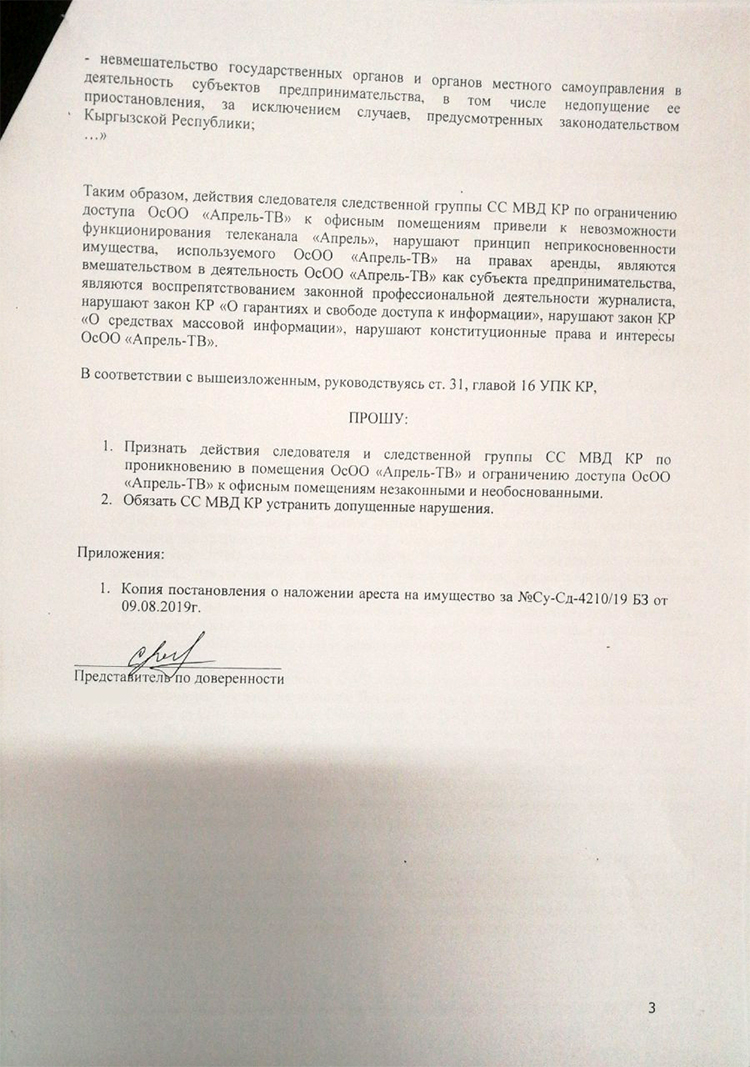 Кроме того, вышеуказанные действия являются воспрепятствованием законной профессиональной деятельности журналиста, нарушают законы «О гарантиях и свободе доступа к информации», «О средствах массовой информации», конституционные права и интересы ОсОО «Апрель-ТВ», добавляют юристы.