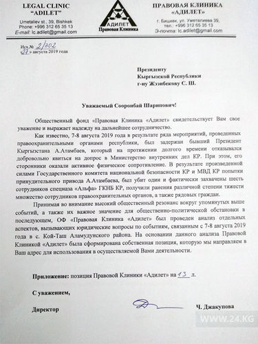 Юристы правовой клиники «Адилет» проанализировали события в Кой-Таше 7-8 августа и установили, что задержание бывшего президента Алмазбека Атамбаева проводилось с нарушениями действующего законодательства. Они обратились с письмом на имя президента КР Сооронбая Жээнбекова.