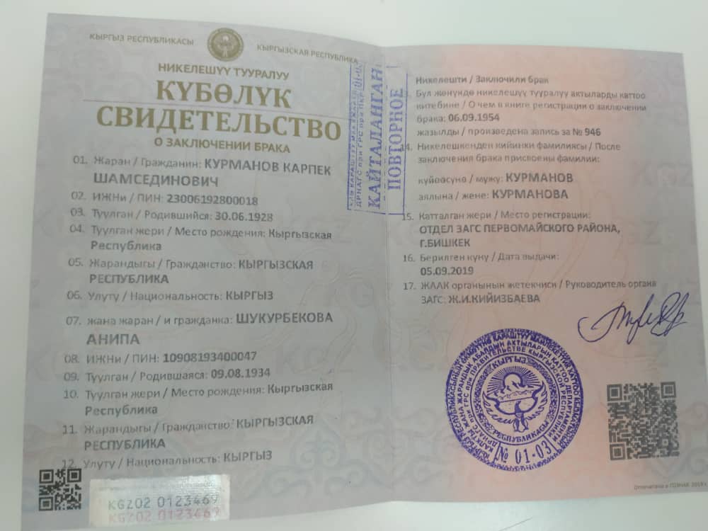 «Пошли в ЗАГС и просто расписались. Домой вернулись, а родные кто что смог принес. Накрыли стол. Свадьбы в современном понимании и не было. Вот, решили устроить родителям настоящий праздник. Кто-то из родных посоветовал выписать повторный документ о регистрации: обновить и документ, и время», — признался Зайнидин Курманов.