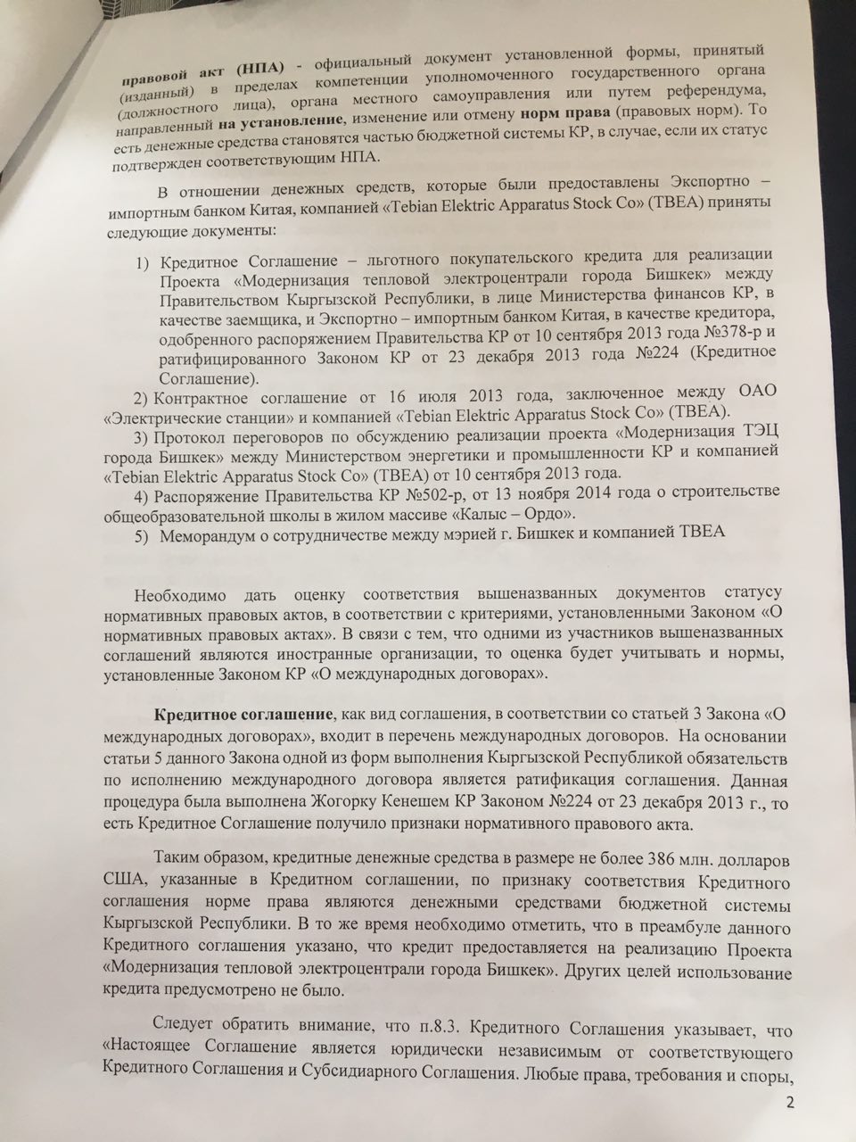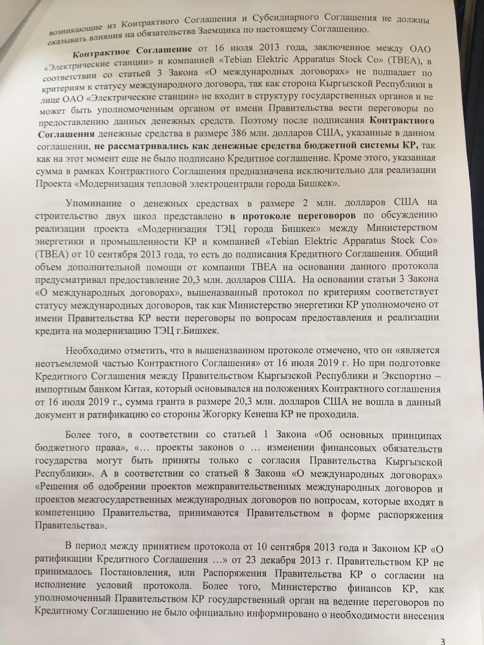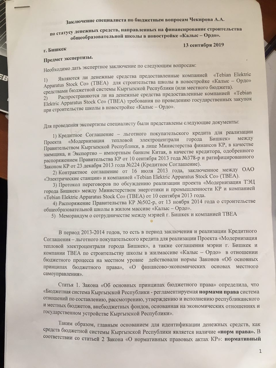 Напомним, что на допросе Асылбека Чекирова настояла защита, которая обратилась к нему с просьбой подготовить заключение по двум вопросам: являются ли средства, предоставляемые китайской компанией, бюджетными или муниципальными и распространяются ли на выделяемые деньги требования законодательства о закупках.