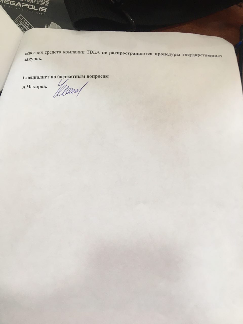 Свидетель отметил, что на основании документов, $2 миллиона, выделенных компанией ТВЕА, являются добровольной спонсорской помощью компании и не являются бюджетными. А следовательно, проведение тендера не требуется. В меморандуме указано, что китайской компании предоставляется право выбирать подрядчика.