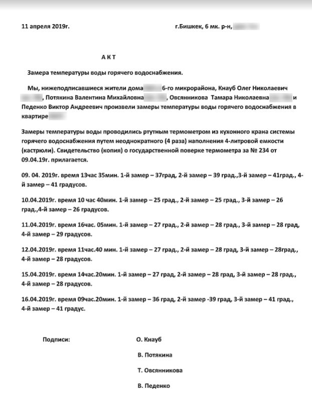В акте надо описать ситуацию, указать замеры, поставить дату. Первичный акт подписывают соседи по подъезду, а по прибытии представителя Бишкектеплосети — две стороны: вы и соседи как потребители услуги и представитель Бишкектеплосети.