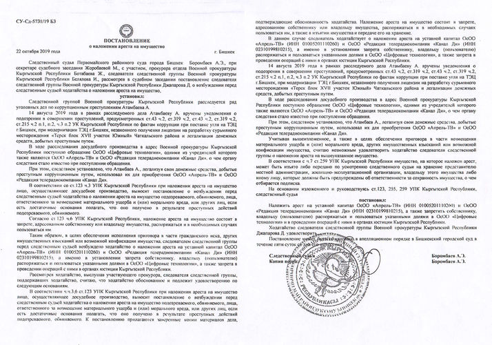 Первомайский районный суд под председательством Абдуразака Боромбаева поддержал заключение Военной прокуратуры и вынес решение об аресте доли телеканала «Апрель» в ОсОО «Цифровые технологии». Об этом 24-kg.com рассказал генеральный директор «Апрель ТВ» Дмитрий Ложников.