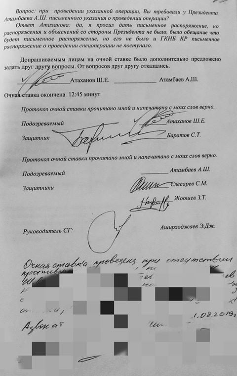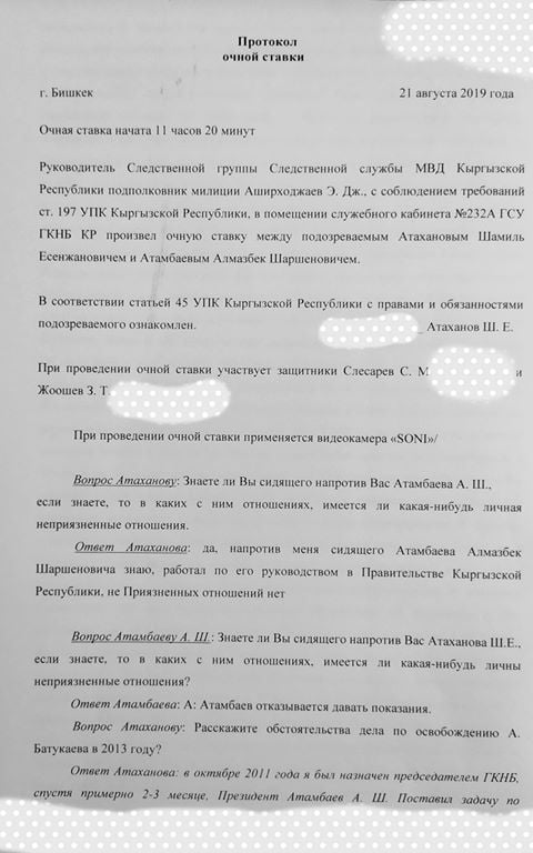 Представители защиты Алмазбека Атамбаева подтвердили 24-kg.com, что бывший глава государства участвовал в очной ставке с Шамилем Атахановым. Но комментировать подлинность документа отказались.
