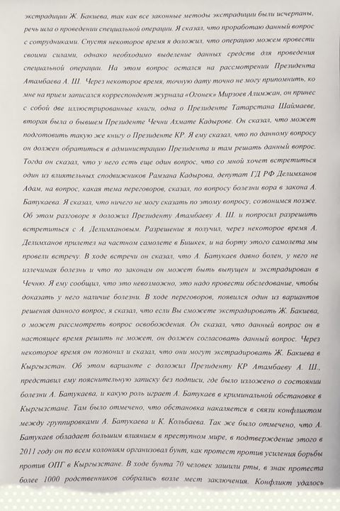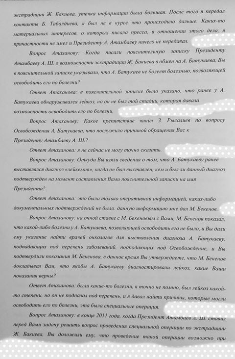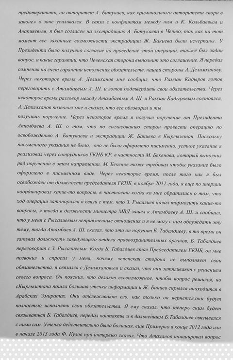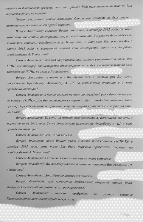 «Об этом варианте я доложил президенту А.Атамбаеву, представил ему пояснительную записку без подписи, где изложил о состоянии болезни А.Батукаева и какую роль он играет в криминальной обстановке в Кыргызстане», — приводятся в протоколе слова Шамиля Атаханова.