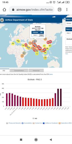 Посольство США в Кыргызстане также установило датчик. Он показывает индекс качества воздуха в режиме онлайн. Последние три часа информация не обновляется. Но в течение дня уровень индекса не опускался ниже красной, опасной для здоровья отметки.