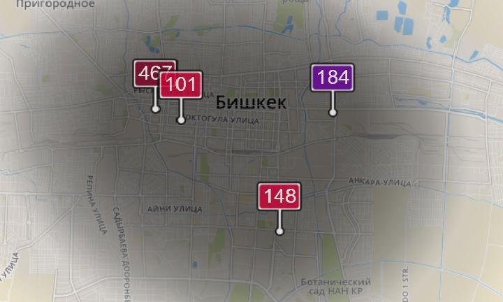 - в районе улиц Бейшеналиевой/Токтогула. Уровень загрязнения превышен в 12,1 раза: PM2.5 среднесуточный — 424 мкг/м³, на момент измерения — 467 мкг/м³;