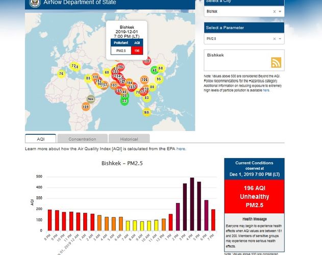 Посольство США в Кыргызстане также установило датчик. Он показывает индекс качества воздуха в режиме онлайн. Информация обновляется ежечасно.