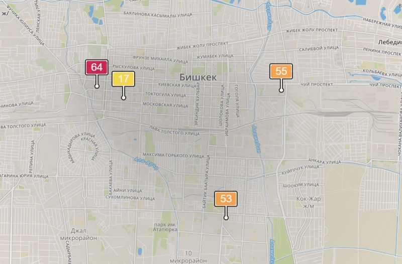 Экологическое движение «МувГрин» установило несколько датчиков в Бишкеке, которые замеряют содержание мелких частиц РМ2.5 в воздухе. Результаты замеров можно наблюдать в режиме реального времени.