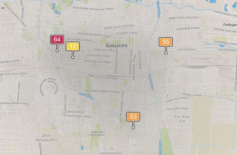 - в районе улиц Бейшеналиевой/Токтогула. Уровень загрязнения превышен в 5,77 раза: PM2.5 среднесуточный — 202 мкг/м³, на момент измерения — 64 мкг/м³;