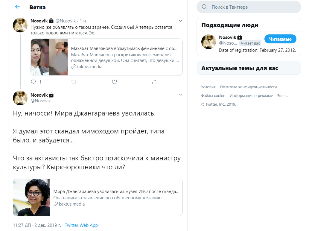 В кыргызском сегменте Twitter нашлись те, кто поддерживает позицию нардепа. Один из пользователей написал, что быть феминисткой — не значит об этом кричать и выставлять напоказ свое обнаженное тело.