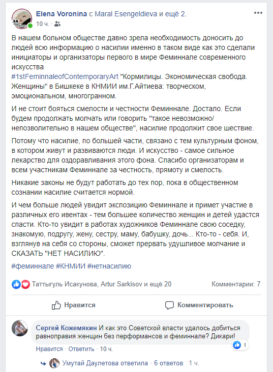 В соцсетях обсуждают прошедшую на прошлой неделе феминале «Кормилицы. Экономическая свобода. Женщины», где в том числе была обнаженная девушка. Свое мнение высказала в Facebook депутат Махабат Мавлянова.