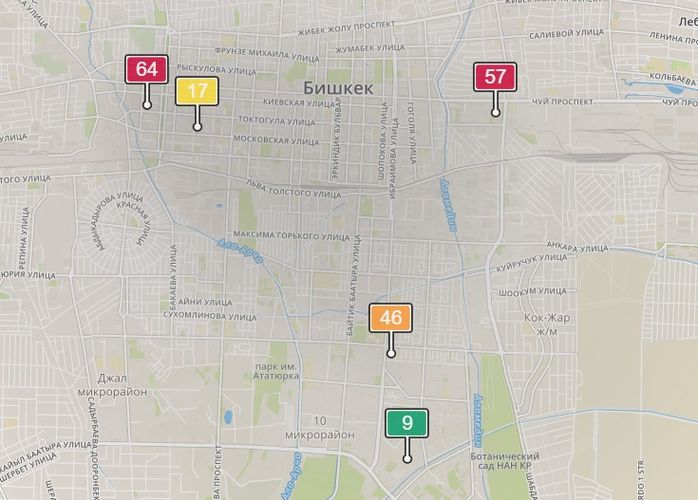 - в районе улиц Бейшеналиевой/Токтогула. Уровень загрязнения превышен в 1,62 раза: PM2.5 среднесуточный — 57 мкг/м³, на момент измерения — 64 мкг/м³;