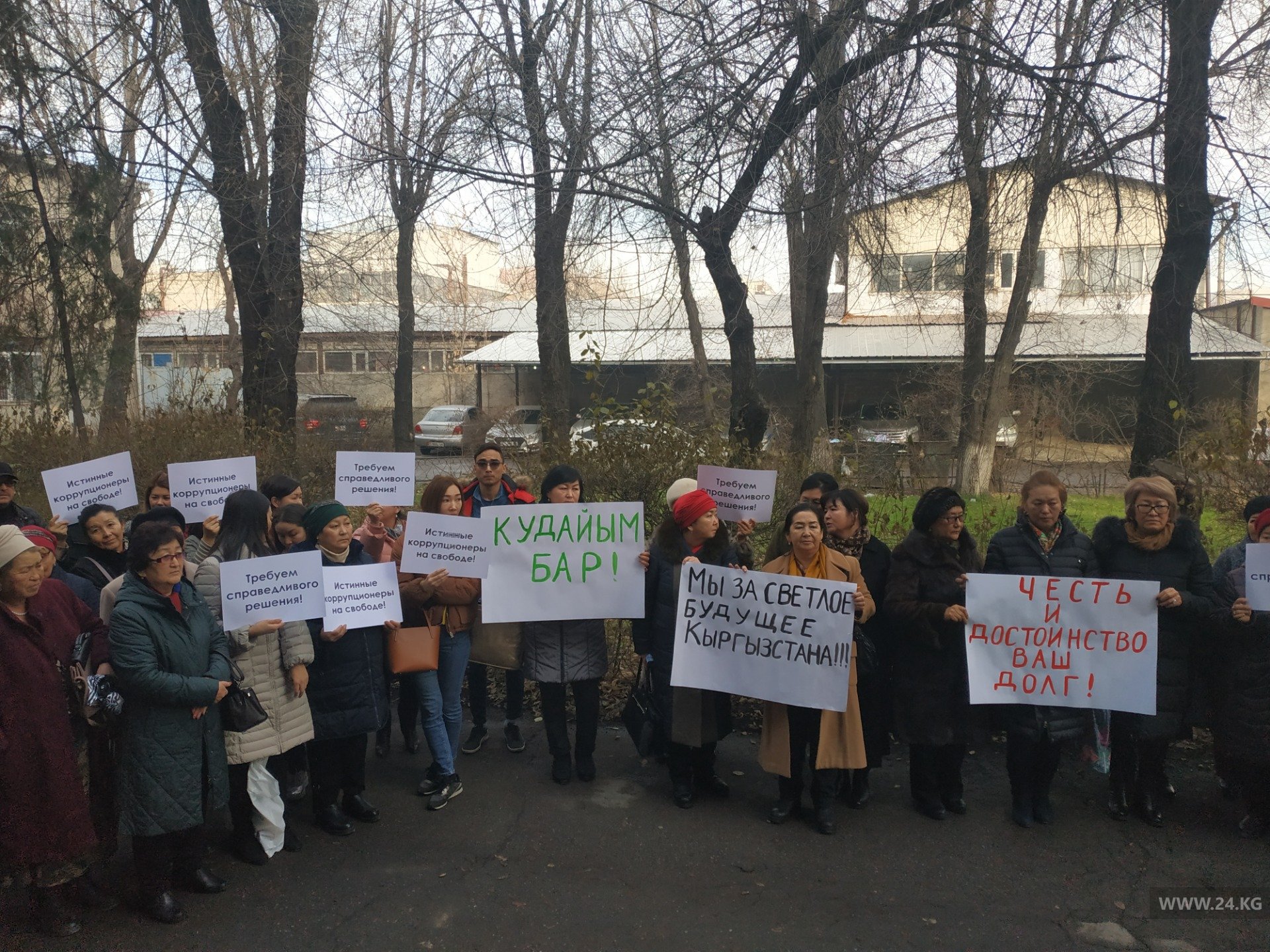Сторонники подсудимых вышли во двор и развернули плакаты с требованием справедливого решения.