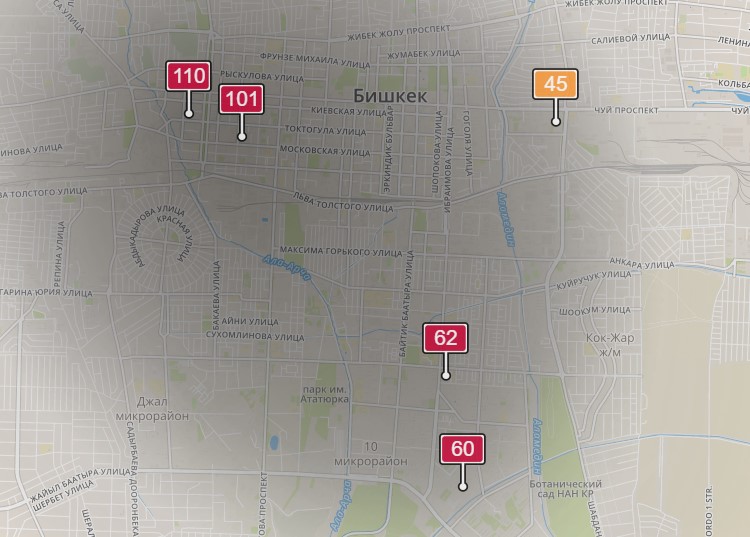 - в районе улиц Бейшеналиевой/Токтогула. Уровень загрязнения превышен в 2,45 раза: PM2.5 среднесуточный — 86 мкг/м³, на момент измерения — 110 мкг/м³;