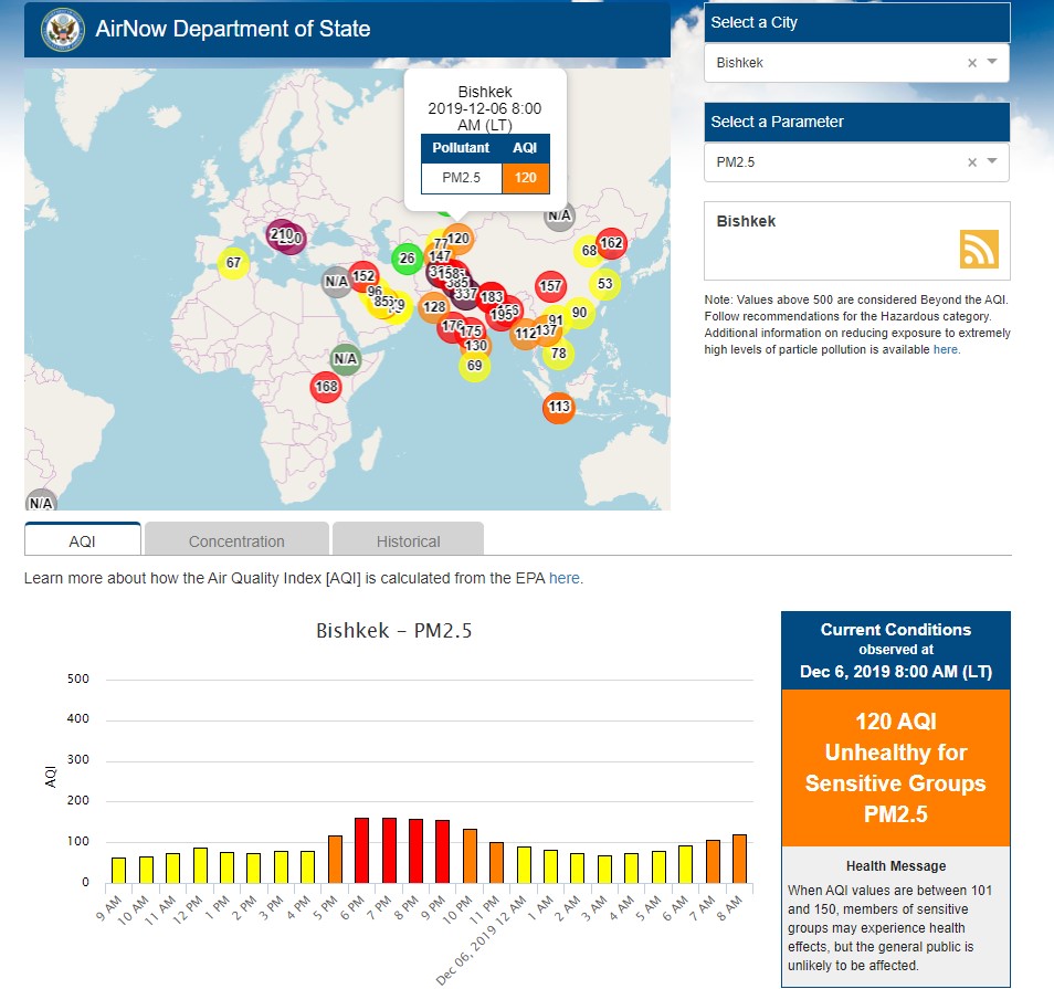 Посольство США в Кыргызстане также установило датчик. Он показывает индекс качества воздуха в режиме онлайн. Информация обновляется ежечасно.