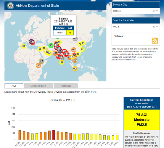 Посольство США в Кыргызстане также установило датчик. Он показывает индекс качества воздуха в режиме онлайн. Информация обновляется ежечасно.