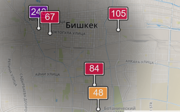 - в районе улиц Бейшеналиевой/Токтогула. Уровень загрязнения превышен в 2,42 раза: PM2.5 среднесуточный — 85 мкг/м³, на момент измерения — 240 мкг/м³;