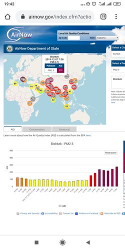 Посольство США в Кыргызстане также установило датчик. Он показывает индекс качества воздуха в режиме онлайн. Информация обновляется ежечасно.