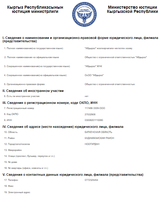 Еще одна организация, которая упоминается в журналистском расследовании, — ОсОО «Абдыраз». Согласно базе данных Министерства юстиции, компания зарегистрирована в Ноогардане Кадамджайского района Баткенской области в июне 2011-го. В октябре 2015 года она прошла перерегистрацию.