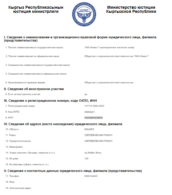 Интересно, что по одному адресу с «Ака Инвест» зарегистрированы еще два ОсОО — «Штарк Групп» и LINOАSIA («ЛИНОАЗИЯ»).