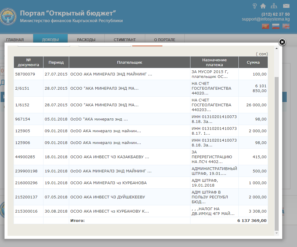 Согласно данным портала «Открытый бюджет», ОсОО «Ака Инвест» заплатило 6 миллионов 137,3 тысячи сомов налогов.
